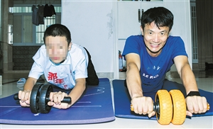 ▲陈勋虎陪伴孤独症儿子一起锻炼身体。